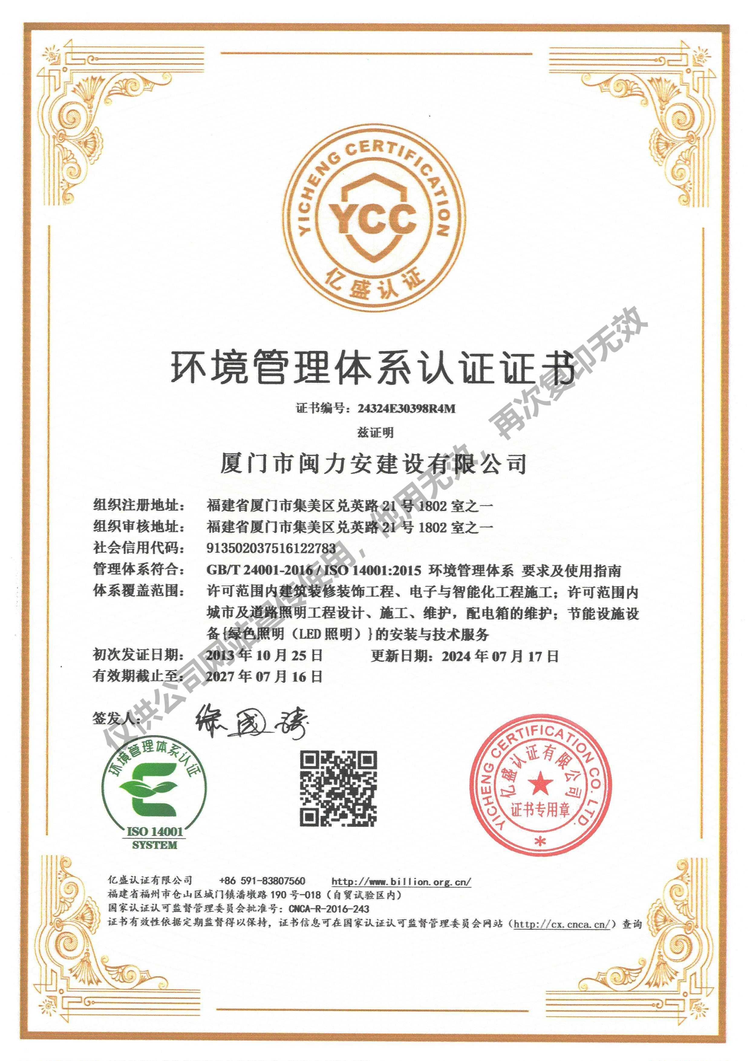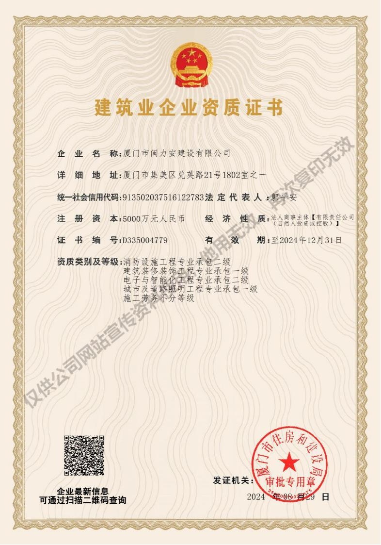 廈門市閩力安建設(shè)有限公司成立于2003年,公司取得市政公用工程施工總承包貳級、建筑裝修裝飾工程專業(yè)承包壹級、城市及道路照明工程專業(yè)承包壹級、電子與智能化工程專業(yè)承包貳級、消防設(shè)施工程專業(yè)承包貳級、電力工程施工總承包叁級、建筑機(jī)電安裝工程專業(yè)承包叁級、輸變電工程專業(yè)承包叁級、環(huán)保工程專業(yè)承包叁級、照明工程設(shè)計專項(xiàng)甲級、建筑裝飾工程設(shè)計乙級、施工勞務(wù)等資質(zhì)的綜合型企業(yè),公司于2013年通過了ISO9001質(zhì)量體系認(rèn)證,ISO14001環(huán)境管理體系認(rèn)證,OHSAS18001職業(yè)健康安全管理體系認(rèn)證。
